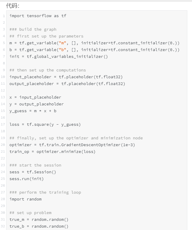 与 HTML 类似,Tensorflow 是用于表示某种类型的计算抽象(称为“计算图”)的框架。当我们用 Python 操作 Tensorflow 时,我们用 Python 代码做的第一件事是组装计算图。之后我们的第二个任务就是与它进行交互(使用 Tensorflow 的“会话”)。但重要的是,要记住计算图不在变量内部,它处在全局命名空间内。莎士比亚曾经说过:“所有的 RAM 都是一个阶段,所有的变量都只不过是指针。”
