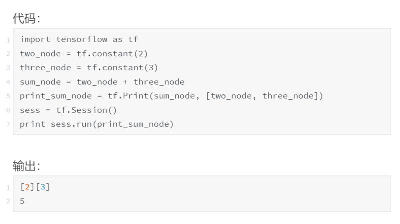这样做通常没有问题,但当代码变得越来越复杂时,这可能有点尴尬。更方便的方法是使用 tf.Print 语句。令人困惑的是,tf.Print 实际上是 Tensorflow 的一种节点,它有输出和副作用!它有两个必需的参数:一个要复制的节点和一个要打印的内容列表。“要复制的节点”可以是图中的任何节点,tf.Print 是与“要复制的节点”相关的标识操作,也就是说,它将输出其输入的副本。不过,它有个副作用,就是会打印“打印清单”里所有的值。