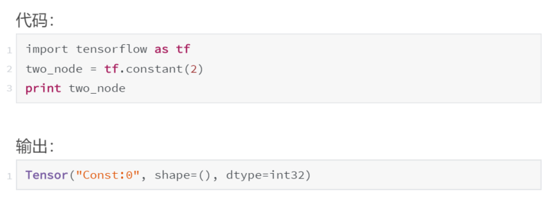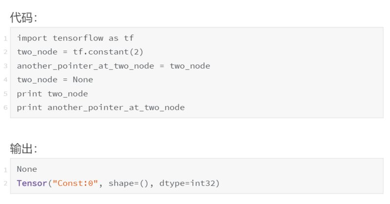 快看!我们得到了一个节点,它包含常量:2。我知道你很惊讶,惊讶的是一个名为 tf.constant 的函数。当我们打印这个变量时,我们看到它返回一个 tf.Tensor 对象,它是一个指向我们刚创建的节点的指针。为了强调这一点,这里是另一个例子: