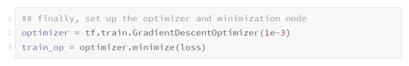 既然你对 Tensorflow 的基本概念已经有了很好的理解,这段代码应该很容易解释!第一行,optimizer = tf.train.GradientDescentOptimizer(1e-3) 不会向图中添加节点。它只是创建了一个 Python 对象,包含了一些有用的函数。第二行 train_op = optimizer.minimize(loss),将一个节点添加到图中,并将一个指针赋给 train_op。train_op 节点没有输出,但有一个非常复杂的副作用: