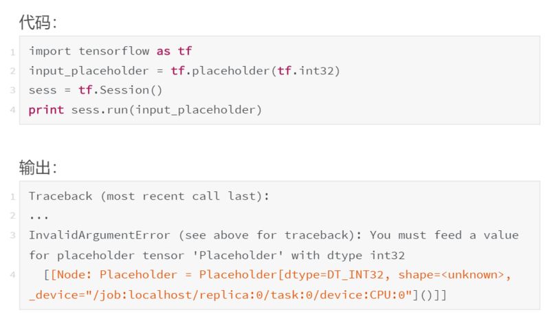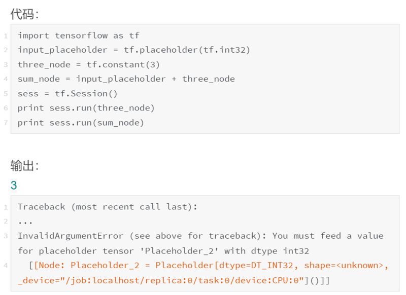 ……这是个糟糕的例子,因为它引发了一个异常。占位符预计会被赋予一个值,但我们没有提供,因此 Tensorflow 崩溃了。