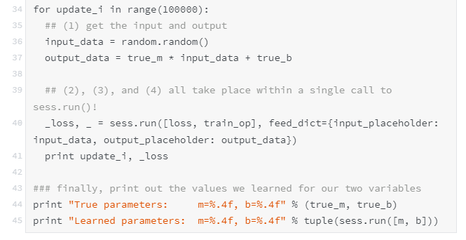 基本上,当我们调用 sess.run(train_op) 时,它为我们对所有的变量做了一个梯度下降的操作。当然,我们还需要使用 feed_dict 来填充输入和输出占位符,并且我们还希望打印这些损失,因为这样方便调试。