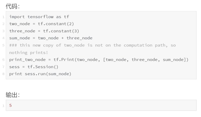 有关 tf.Print 的一个重要却有些微妙的点:打印其实只是它的一个副作用。与所有其他副作用一样,只有在计算流经 tf.Print 节点时才会进行打印。如果 tf.Print 节点不在计算路径中,则不会打印任何内容。即使 tf.Print 节点正在复制的原始节点位于计算路径上,但 tf.Print 节点本身可能不是。这个问题要注意!当这种情况发生时,它会让你感到非常沮丧,你需要费力地找出问题所在。一般来说,最好在创建要复制的节点后立即创建 tf.Print 节点。