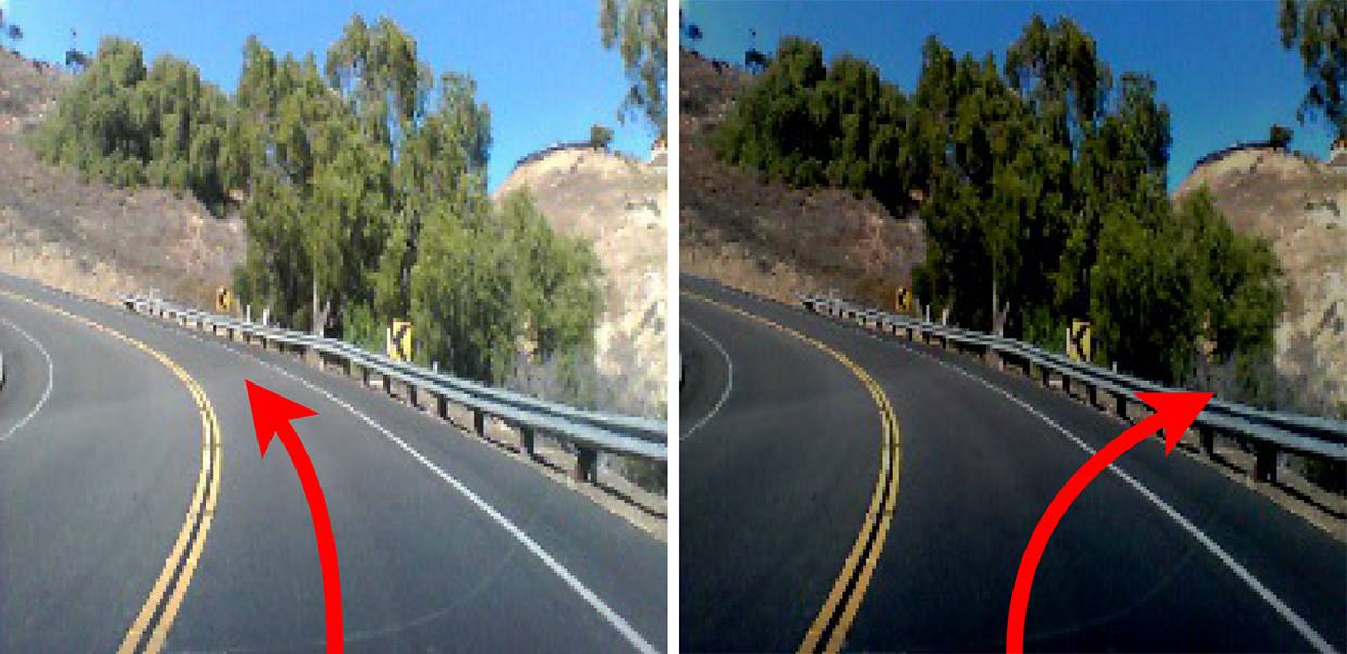 图 | 这张来自 DeepXplore 的一个例子向我们显示,在稍微暗一点的右图中,英伟达的 DAVE-2 自动驾驶汽车软件会让汽车撞上护栏。