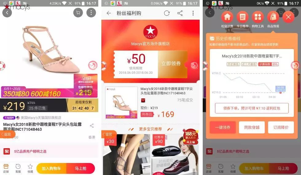 Macy's 女鞋在聚划算中原价 219 元,松鼠识惠自动找券领 50 元优惠券,再加上 7.10 元的返利,最终实际花费 161.9 元。