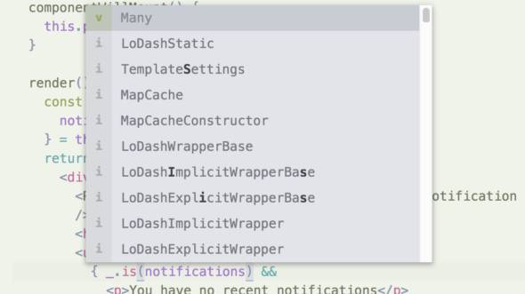 在其他地方,自动补全功能可从一个 React 组件的 Prop Type 中识别出参数,并自动建议。进一步的自动补全功能需要通过按下 ctrl-space 手动触发。一个例子是搜索 lodash 函数,搜索“is”返回 lodash 包,而不是个别单独的函数。这是 VS Code 中的一个自动功能。