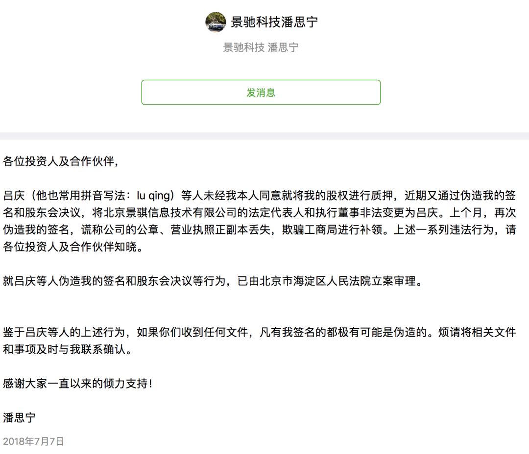 7月7日下午,景驰科技法人代表潘思宁在个人公众号上发布一则重磅公告:景驰科技CFO吕庆等人未经潘本人同意,将潘思宁的股权进行质押,近期又通过伪造潘思宁的签名和股东会决议,将北京景骐信息技术有限公司的法定代表人和执行董事非法变更为吕庆。上个月,再次伪造潘思宁的签名,谎称公司的公章、营业执照正副本丢失,欺骗工商局进行补领。潘思宁还在文中写到,该事件已由北京市海淀区人民法院立案审理。