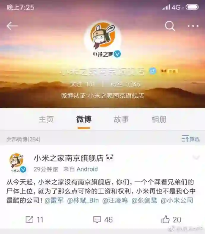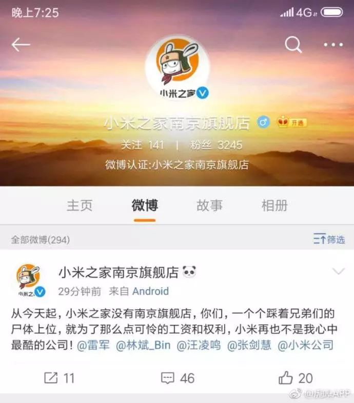 @虎嗅【小米之家南京旗舰店官微发文维权后删号,小米:账号被盗】11日晚,拥有3200多名粉丝@小米之家南京旗舰店 发布微博称:“从今天起,小米之家没有南京旗舰店,你们,一个个踩着兄弟们的尸体上位,就为了那么点可怜的工资和权利,小米再也不是我心中最酷的公司!”微博同时还@雷军、林斌等小米高管。
