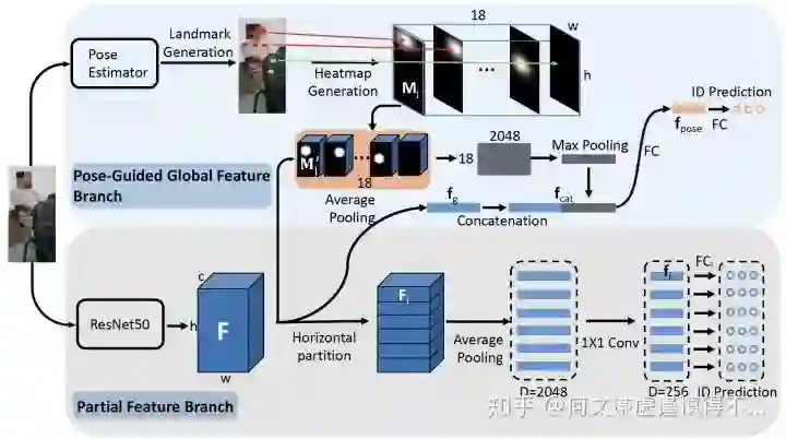 看到这个算法示意图,相信熟悉Reid话题的研究伙伴应该会觉得十分熟悉,上半branch的pose guided attention以及下半与PCB几乎相同的分支,其实不用做过多解释就可以明白整个方法在做什么事。