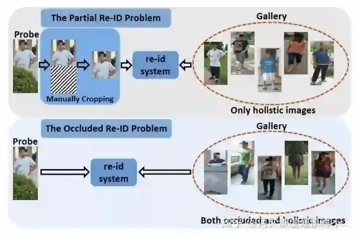 此外introduction部分还区分了partial reid和occluded reid的区别:前者的query为partial的人图,而gallery中全都是没有遮挡以及切分的完整人图;后者的query为遮挡的人图,而gallery是遮挡与未遮挡的图都有。