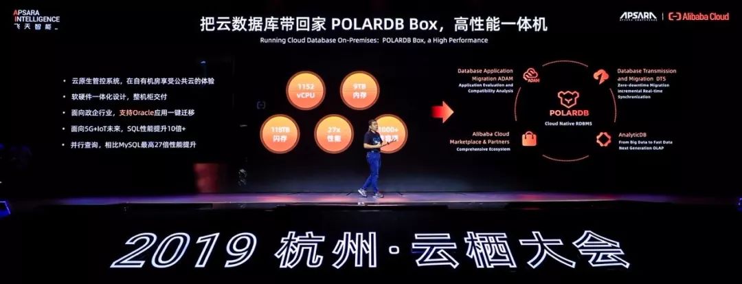 阿里云宣布正式推出高性能数据库一体机——POLARDB BOX,用户部署在自有数据中心即可享受云数据库的便捷体验,同时还为Oracle等传统数据库用户提供一键迁移功能,最多节省95%迁移成本,更适合政企、交通、航运、金融等行业。