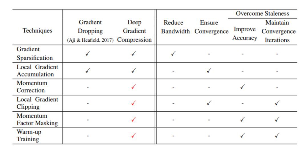 表 1:深度梯度压缩(DGC)中应用到的技术。