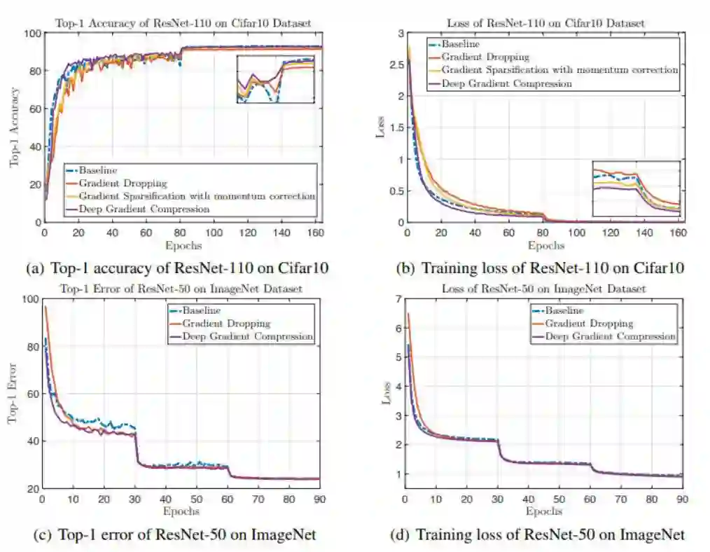 图 3:ResNet 在图像分类任务上的学习曲线(梯度稀疏度为 99.9%)。(a)ResNet-110 在 CIFAR-10 数据集上的 top-1 准确率;(b)ResNet-110 在 CIFAR-10 数据集上的训练损失;(c)ResNet-50 在 ImageNet 数据集上的 top-1 准确率;(d)ResNet-50 在 ImageNet 数据集上的训练损失。