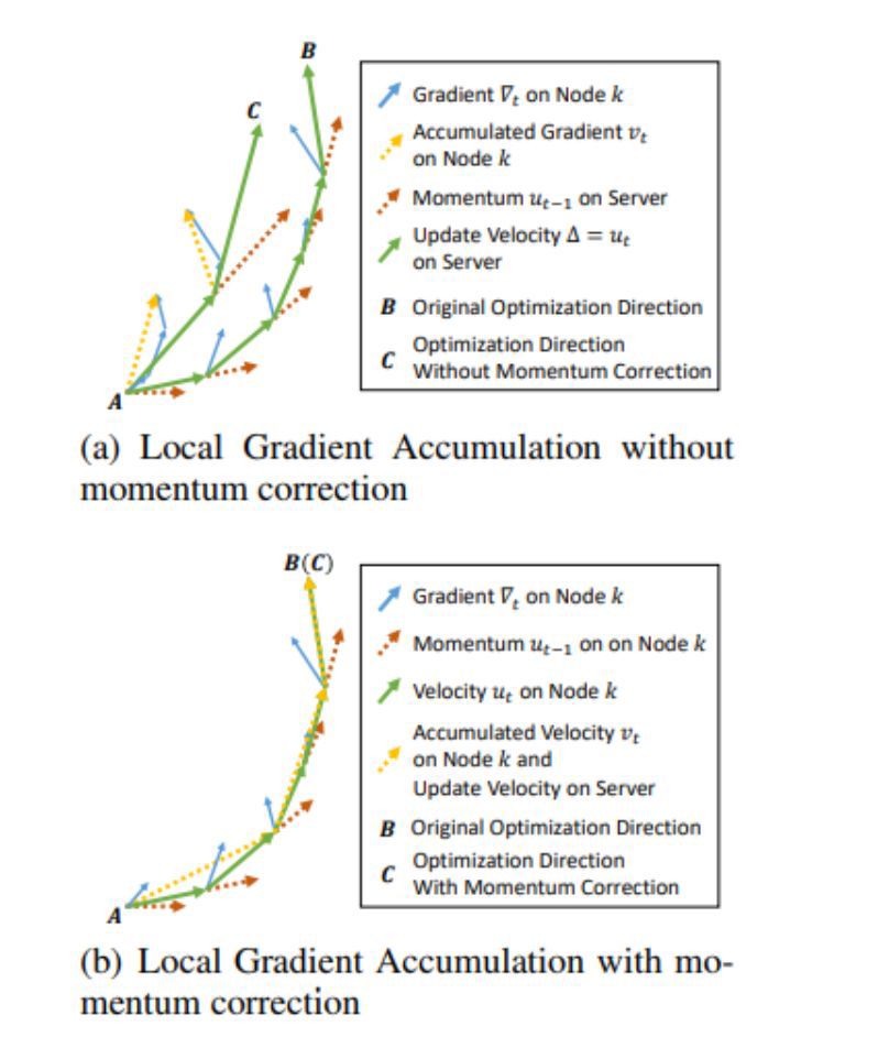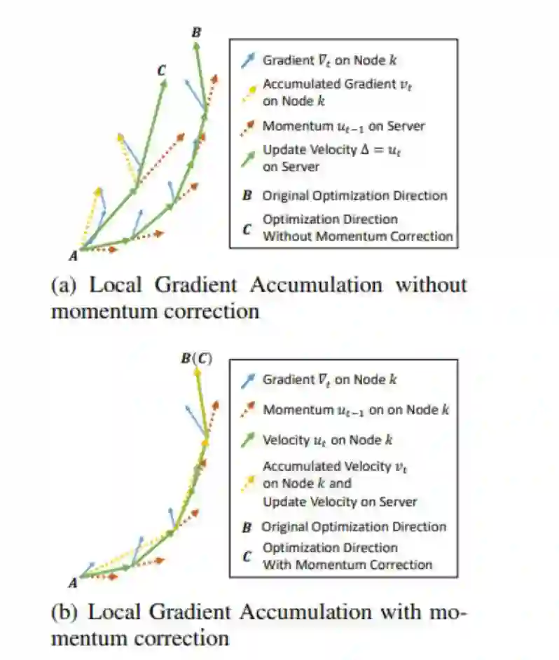 图 2:动量修正图示:(a)没有使用动量修正的局域梯度累积(Local Gradient Accumulation);(b)使用动量修正的局域梯度修正。