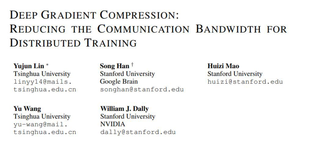深度梯度压缩(Deep Gradient Compression,DGC)通过压缩梯度解决了通信带宽问题,如图 1 所示。为了确保没有损失准确率,DGC 在梯度稀疏化之上应用了动量修正(momentum correction)和局域梯度修剪(local gradient clipping)方法。DGC 还应用了动量因子掩蔽(momentum factor masking)和预热训练(warm-up training)以克服通信量减少带来的陈化问题。