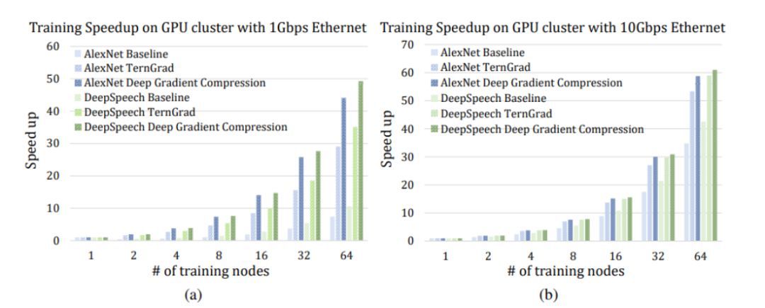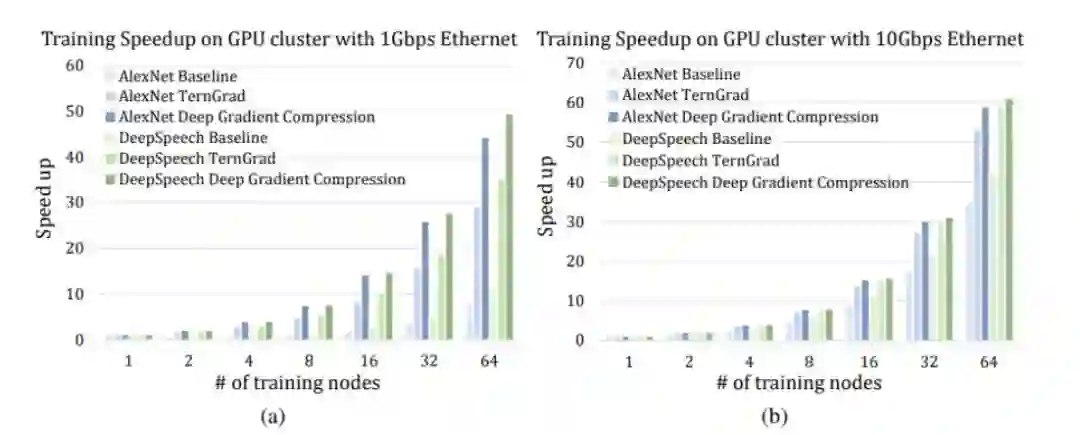 我们使用了 Wen 等人(2017)提出的性能模型来执行可扩展性分析,将单个训练节点上的轻量剖析和分析通信建模技术结合了起来。通过全归约(all-reduce)通信模型(Rabenseifner, 2004; Bruck et al., 1997),在最坏的情况下,稀疏数据的密度在每个聚合步骤翻一番。然而,即使考虑了这种效应,DGC 仍然能显著地减少网络通信时间,如图 6 中所示。图 6 展示了多节点训练和单节点训练的加速性能对比。传统的训练方法在 1Gbps(图 6(a))的以太网上的加速性能相比在 10Gbps(图 6(b))上的加速性能要差很多。尽管如此,DGC 可以将 1Gbps 以太网上的训练过程进行优化,并得到和 10Gbps 以太网训练相当的结果。例如,当将 AlexNet 在 64 个节点上训练时,传统的训练方法在 10Gbps 以太网上仅能达到约 30 倍的加速(Apache, 2016),而应用 DGC 时,仅仅在 1Gbps 以太网上训练就能获得 40 倍的加速。对比图 6 中的(a)和(b),当通信-计算比率更高,以及网络带宽更低时,DGC 的优势更加明显。
