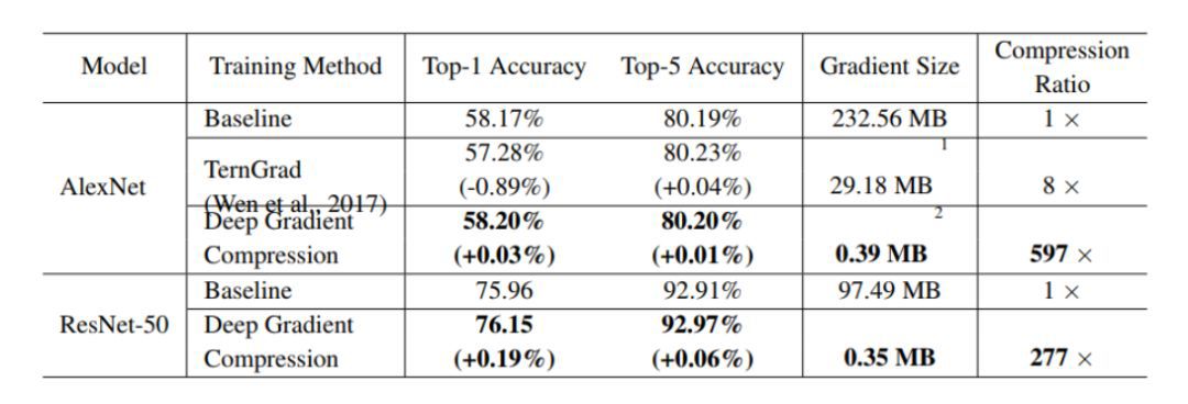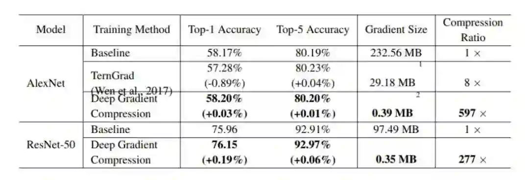 表 3:AlexNet 和 ResNet-50 模型的多种优化方法在 ImageNet 数据集上得到的梯度压缩率对比。