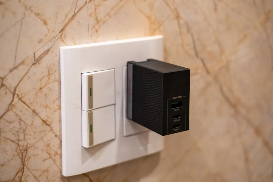 于是,我决定购买一款多口氮化镓充电器来解放我的肩膀。根据我自己的充电需求,我至少需要 2 个 USB-C 接口和 1 个 USB-A 接口,最大充电功率可以喂饱偶尔带出门的 MacBook Pro。同时,考虑到酒店、车站、星巴克等公共场所老化的插座,我还排除了倍思、努比亚等品牌口红造型的氮化镓充电器,因为这种外形设计的充电器插在松动的插座上时极易掉落。