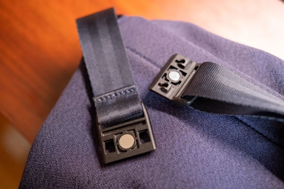 首先,Bellroy Sling 单肩包的背负设计让包体更贴合后背,可以让我在走路过程中肢体不会收到包体的影响,也不会不小心碰到其他人或者物品;其次,这款单肩包虽然很小但还是做了一个大小袋两个分层,大袋里还有一个绒布内衬的小兜可以用来收纳眼镜/墨镜,可以基本满足出行物品的收纳整理需求;最后,磁吸搭扣的设计非常有意思且实用,单手即可解开背带,免去了斜挎单肩包时把肩带从头部绕一圈取下的麻烦。