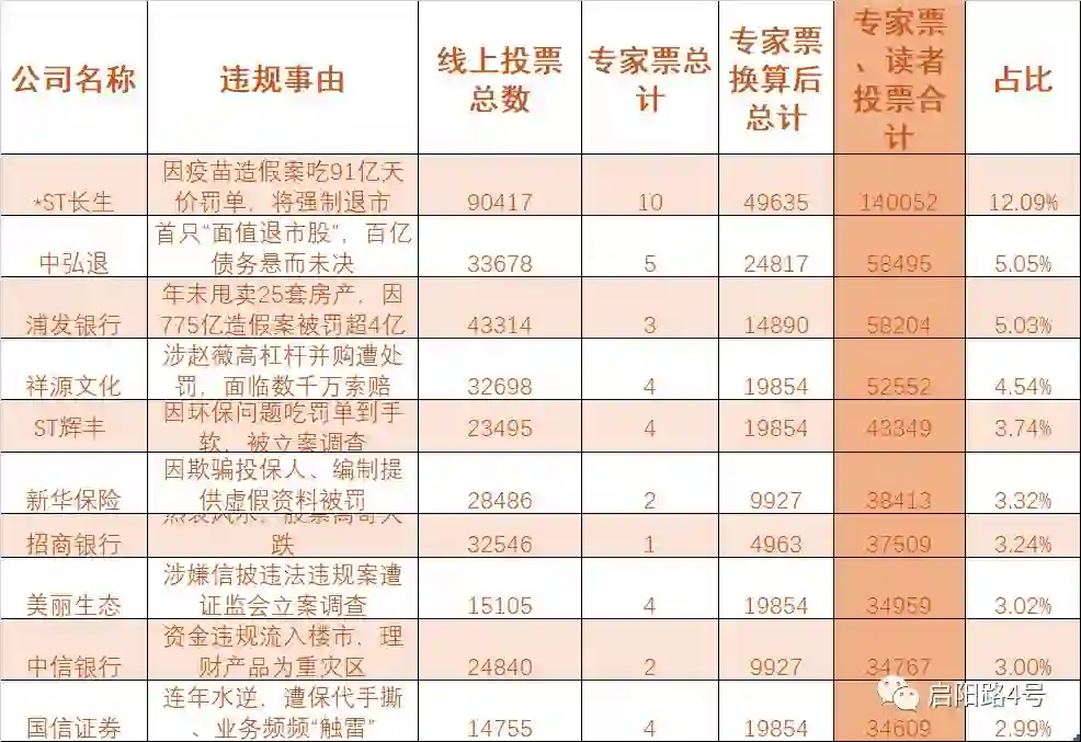 此外,十位参与评选的专家,全部投票给长生生物。专家票换算后,长生生物以12.09%的票选总占比排在第一位,以绝对领先优势成为“2018年A股违规之王”。
