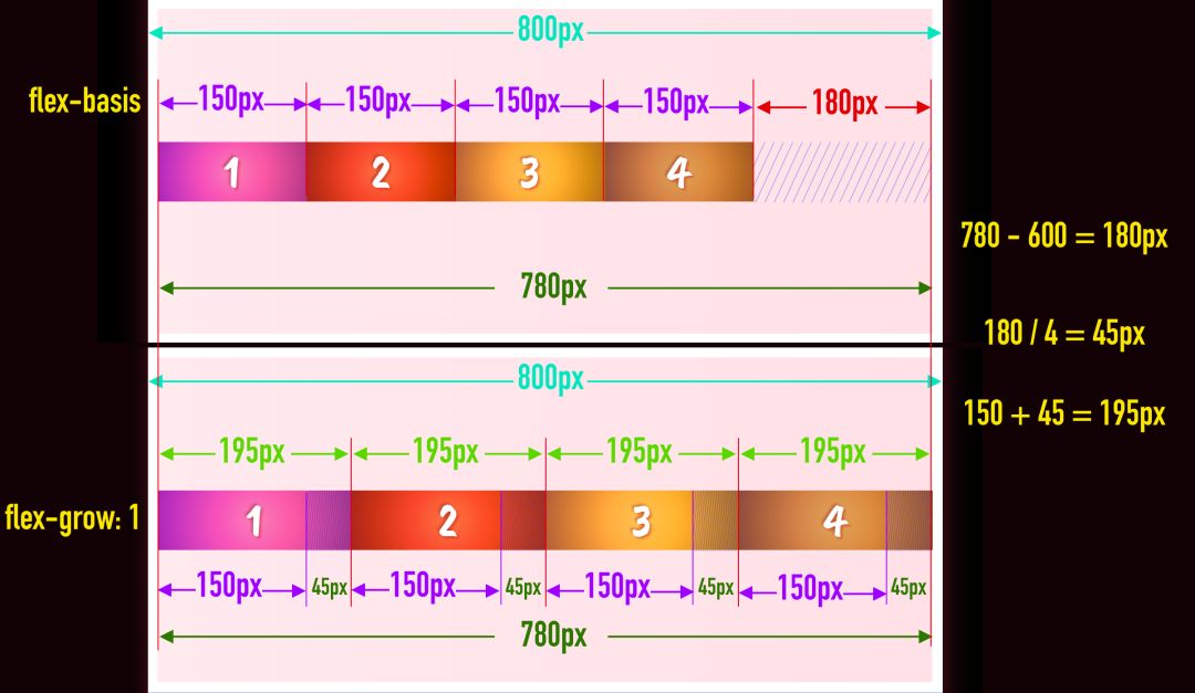 当所有的Flex项目具有一个相同的flex-grow值时,那么Flex项目将会平均分配Flex容器剩余的空间。在这种情况之下将flex-grow的值设置为1。比如下面这个示例,Flex容器(width: 800px,padding: 10px)中有四个子元素(Flex项目),显式的设置了flex-basis为150px,根据前面介绍的内容,我们可以知道每个Flex项目的宽度是150px,这样一来,所有Flex项目宽度总和为150px * 4 = 600px。容器的剩余空间为780px - 600px = 180px。当显式的给所有Flex项目设置了flex-grow为1(具有相同的值)。这样一来,其告诉浏览器,把Flex容器剩余的宽度(180px)平均分成了四份,即:180px / 4 = 45px。而flex-grow的特性就是按比例把Flex容器剩余空间分配给Flex项目(当然要设置了该值的Flex项目),就该例而言,就是给每个Flex项目添加了45px,也就是说,此时Flex项目的宽度从150px扩展到了195px(150px + 45px = 195px)。如下图所示: