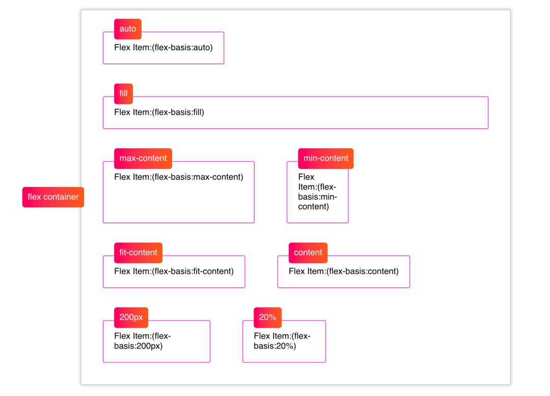 flex-basis属性在任何空间分配发生之前初始化Flex项目的尺寸。其默认值为auto。如果flex-basis的值设置为auto,浏览器将先检查Flex项目的主尺寸是否设置了绝对值再计算出Flex项目的初始值。比如说,你给Flex项目设置的width为200px,那么200px就是Flex项目的flex-basis值。