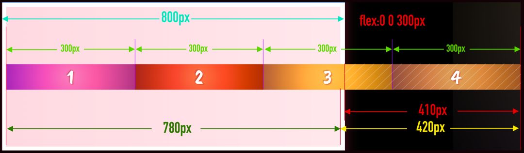 假设把Flex项目的width从100px调到300px,那么所有Flex项目的宽度总和就变成了300px * 4 = 1200px。这个时候Flex项目就溢出了Flex容器,这个溢出的宽度,即1200px - 780px = 420px。这个420px就是我们所说的Flex容器的不足空间: