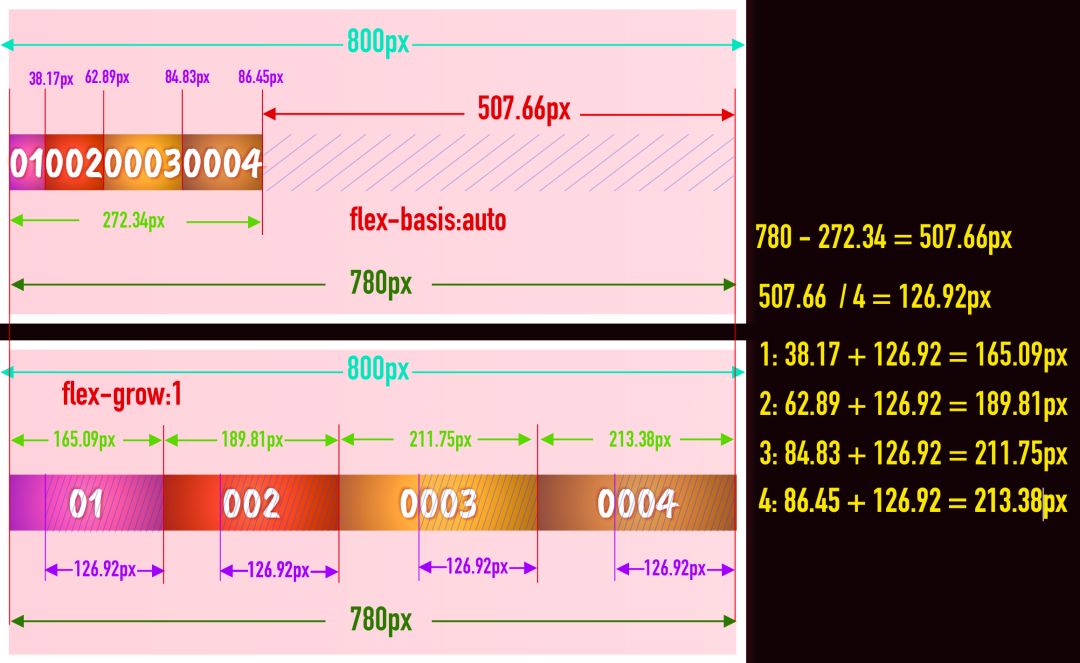 就上图而言,所有Flex项目的flex-shrink之和为10(1 + 2 + 3 + 4 = 10),此时把Flex容器不足空间420px分成了十份,每一份42px(420 / 10 = 42px),每个Flex项目按照自己的收缩因子相应的去收缩对应的宽度,此时每个Flex项目的宽度就变成: