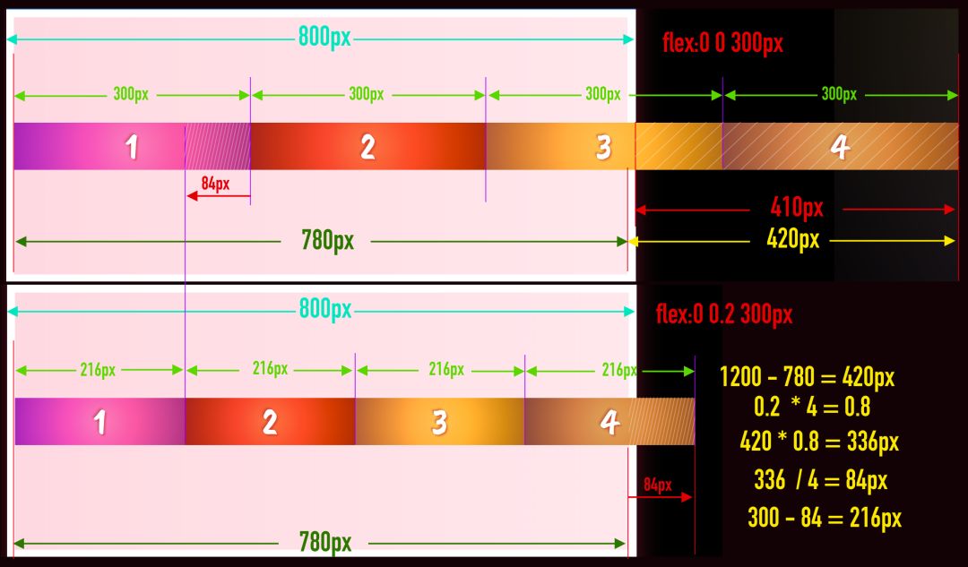 从结果的示例图中我们可以看出来,当所有Flex项目的收缩因子(flex-shrink)总和小于1时,Flex容器不足空间不会完全分配完,依旧会溢出Flex容器。好比该例,flex-shrink的总和是.8,分配了Flex容器剩余空间420px的80%,即336px(还有84px剩余空间未完全分配完),由于每个Flex项目的收缩因子是相同的,好比前面的示例,都设置了1类似,把分配的空间336px均分为四份,也就是84px,因此每个Flex项目的宽度由当初的300px变成了216px(300 - 84 = 216px)。这个其实和flex-grow类似,只不过flex-shrink只是收缩而以。