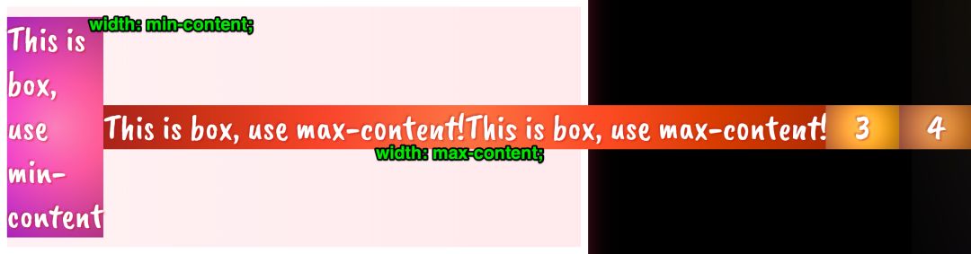 如果内容是英文的话,min-content的宽度将取决于内容中最长的单词宽度,中文就有点怪异(其中之因目前并未深究),而max-content则会计算内容排整行的宽度,有点类似于加上了white-space:nowrap一样。
