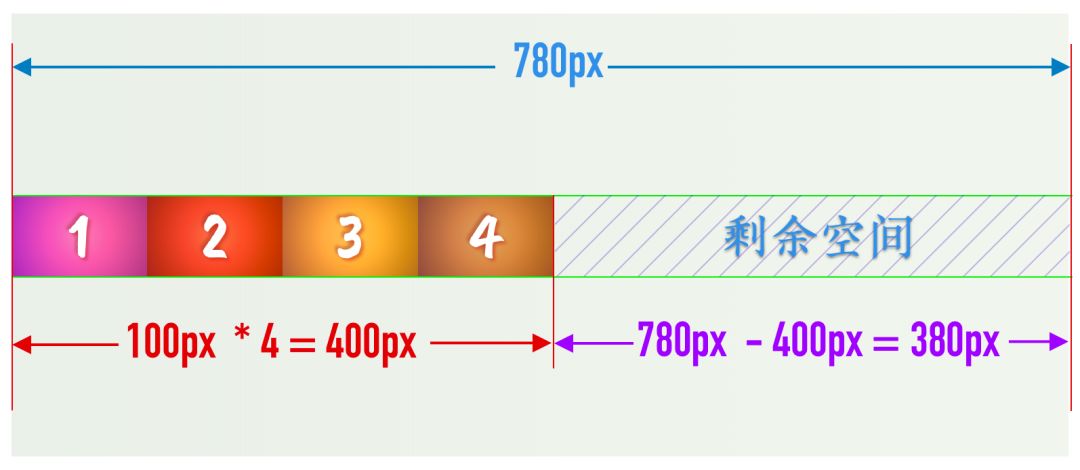 假设Flex容器中包含了四个Flex项目,而且每个Flex项目的width都为100px,那么所有Flex项目的宽度总和则是100px * 4 = 400px(Flex项目没有设置其他任何有关于盒模型的尺寸),那么Flex容器将会有剩余的空间出来,即780px - 400px = 380px。这个380px就是我们所说的Flex容器的剩余空间: