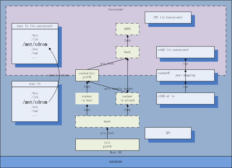 cocker 是个人用 C 语言完全自研的容器引擎(对标 Docker),使用到了以下 Linux 底层技术:LXC、cgroup、overlayfs、iptables、ptms 等。系统架构如下: