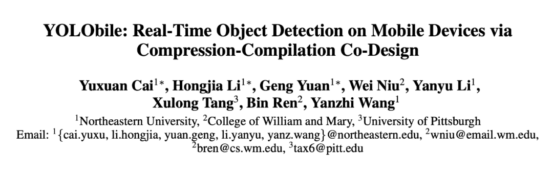 为了更好地满足目标检测框架的落地需求,CoCoPIE 团队:美国东北大学王言治研究组和威廉玛丽学院任彬研究组共同提出了名为 YOLObile 的手机端目标检测加速框架。YOLObile 框架通过「压缩 - 编译」协同设计在手机端实现了高准确率实时目标检测。该框架使用一种新提出的名为「block-punched」的权重剪枝方案,对模型进行有效的压缩。在编译器优化技术的协助下,在手机端实现高准确率的实时目标检测。该研究还提出了一种高效的手机 GPU - 手机 CPU 协同计算优化方案,进一步提高了计算资源的利用率和执行速度。