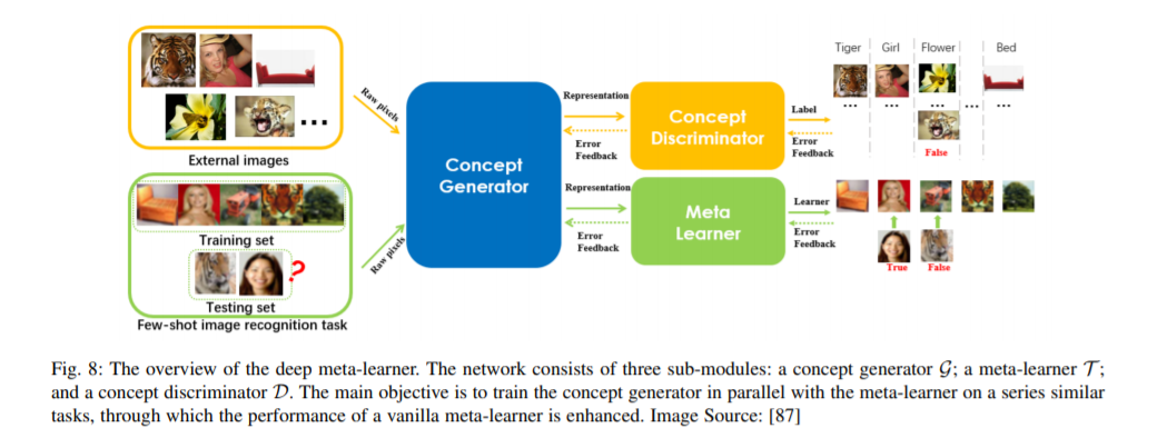 元学习领域的早期研究工作是Yoshua和Samy Bengio[67]以及Fei-Fei Li在less -shot learning[68]中完成的。度量学习是使用的较老的技术之一,其目标是从嵌入空间中学习。将图像转换为嵌入向量,特定类别的图像聚在一起,而不同类别的图像聚在一起比较远。另一种流行的方法是数据增强,从而在有限的可用样本中产生更多的样本。目前,基于语义的方法被广泛地研究,分类仅仅基于类别的名称及其属性。这种基于语义的方法是为了解决零样本学习应用的启发。