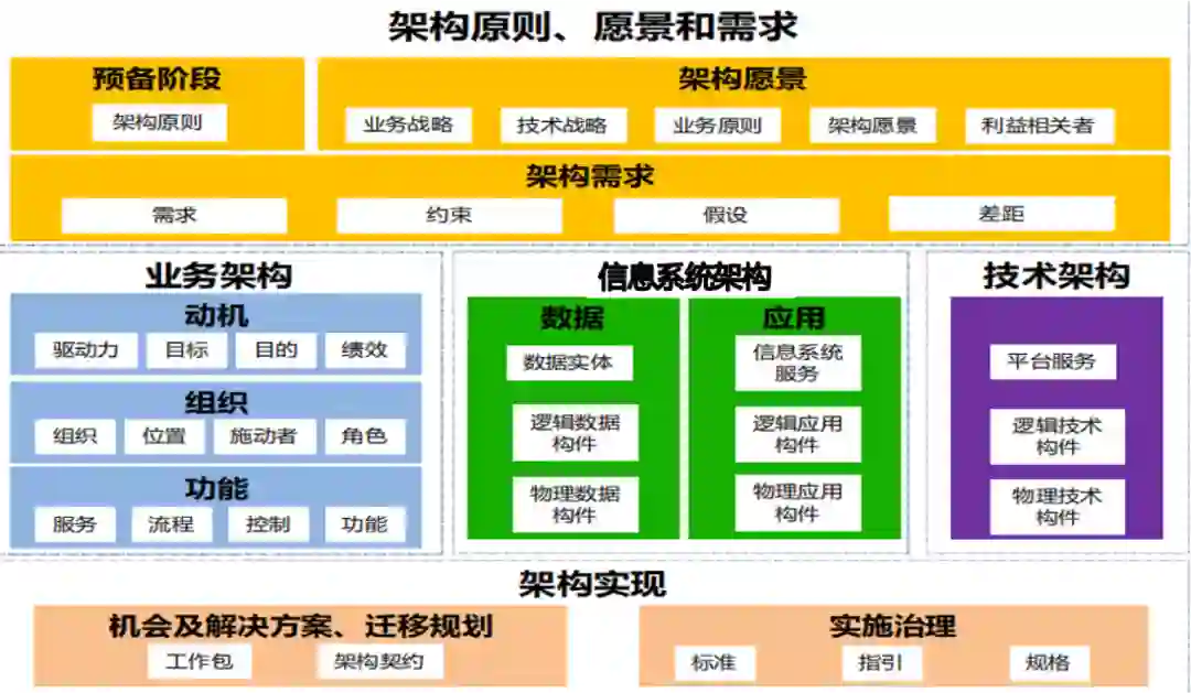 既然提到了“大多数”这个词,那就意味着企业架构理论还有别的方法论,是的,还有联邦企业架构框架(Federal Enterprise Architecture Framework,FEAF)、国防部架构框架(Department of Defensive Architecture Framework,DoDAF)、CBM(Component Business Model)等一系列企业架构框架和方法论。总的来讲,这些方法论之间的差异就是用什么样的理念进行企业的整体设计,本文不在此展开了,笔者有关于企业架构理论的专著讨论此事。