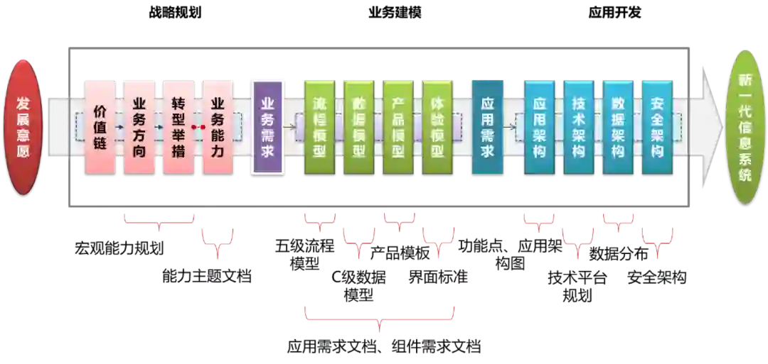 整体看,企业架构的设计既包括对了对企业的愿景、战略、业务、组织的分析,有包括基于业务分析而进行的应用系统设计分析,是业务与技术相连接的设计思维。但是,企业架构也有一个问题,就是大多数企业架构理论都没有很好地给出从业务分析到应用设计的衔接方法。