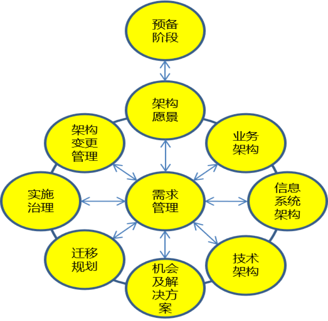 但是,不得不说,TOGAF 的很多实践还是在借用其理念而不是完整、一板一眼地按照其方法论进行实施,所以,业界也常有一个说法,就是,判断一个项目是否是 TOGAF 项目,不是看其交付物,而是看其过程。也就是说,不是对着 TOGAF 手册去检查设计文档是不是种类齐全,而是看项目执行过程是不是接近 TOGAF 的 ADM 过程模型,也就是类似下图这个过程模型:
