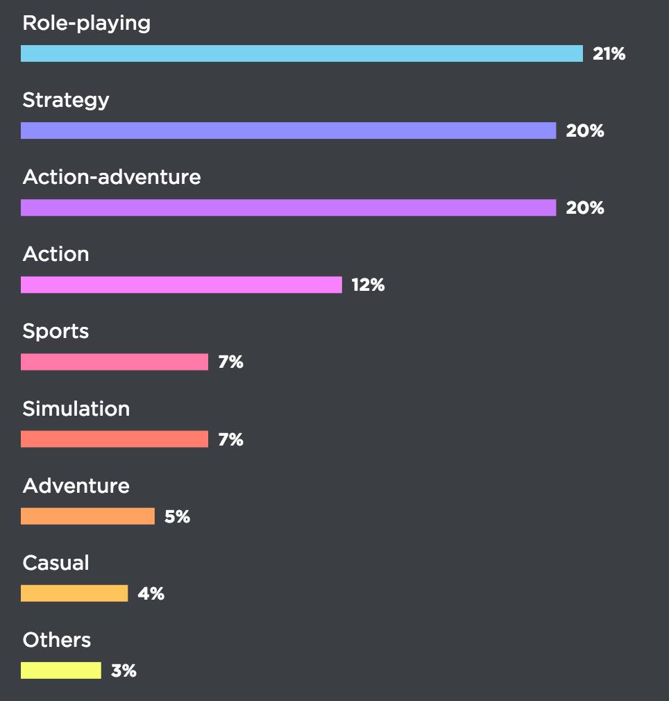 而在游戏类型方面,全职开发人员更喜欢玩模拟和策略类游戏,兼职开发者和自由职业者偏爱动作(冒险)和角色扮演类游戏,学生则独爱动作冒险类。