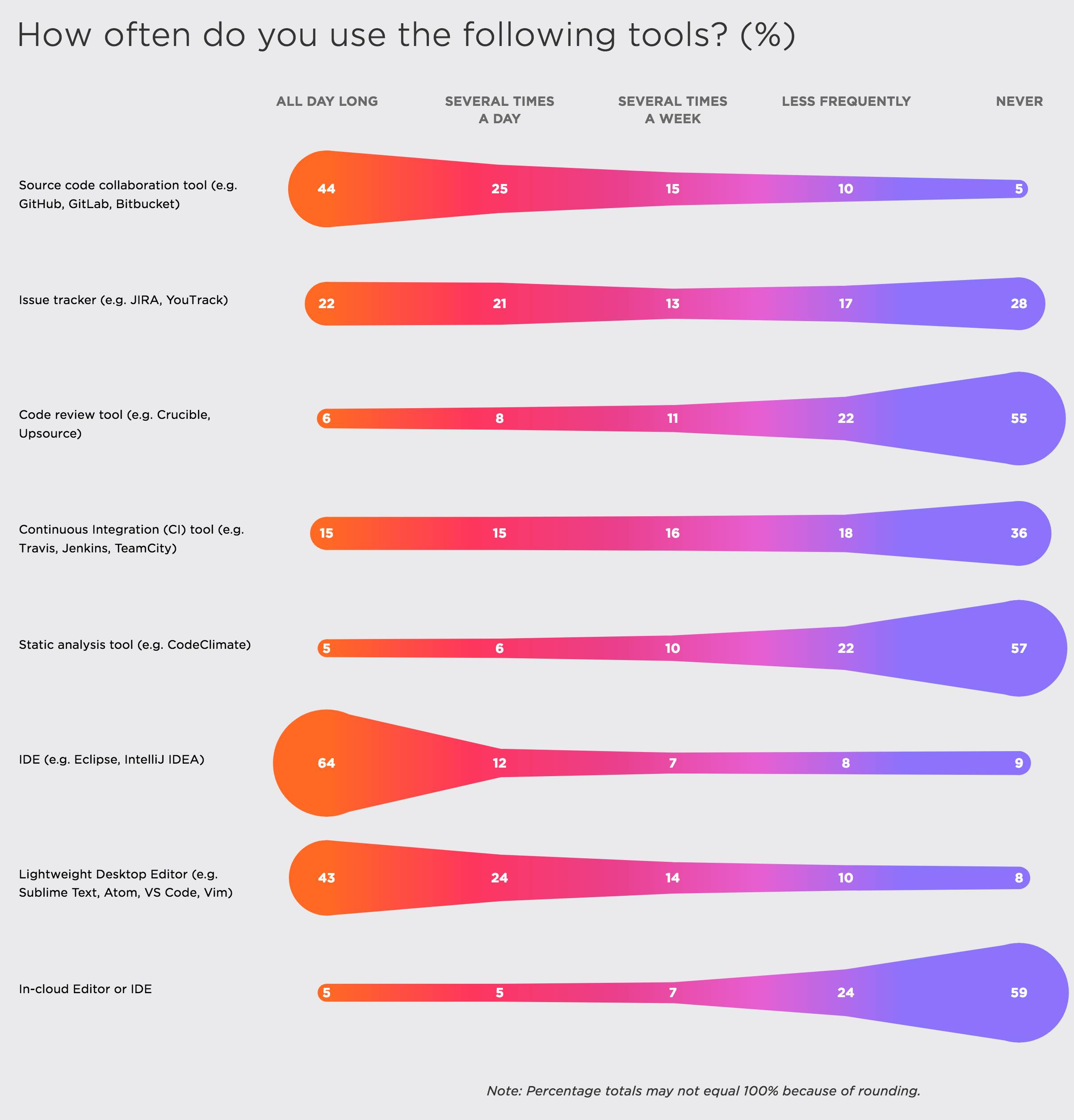 IDE 是开发者日常工作中最常使用的工具,占比远超其他选项,有超过 70% 的 Java 和 C#开发人员整天都在使用 IDE ,C 和 C ++ 分别为 40% 和 50% 。另外,随着开源的流行,开发人员使用源码协作工具的频率已超过代码编辑器。