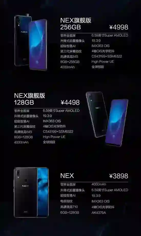 NEX 售价 3898 元起,分为标准版和旗舰版,标准版采用骁龙 710 处理器,6GB 运存 +128GB 内存;旗舰版则采用骁龙 845 处理器,8GB 运存 +128/256GB 内存。手机将于 23 日上午 10 点开售。