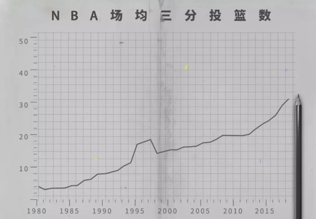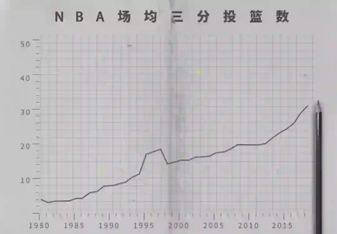 不过,随着像拉里·伯德、雷吉·米勒和雷·阿伦这样精于三分球的射手逐渐出现,三分球的价值终于开始被重视。随后三十多年,NBA比赛中的三分出手次数稳步上升。到上赛季,NBA球队平均每场的三分球出手次数已经多达29次。当今赛场上,不但小个子球员往往都三分精准,大个子里能投三分的也大有人在。
