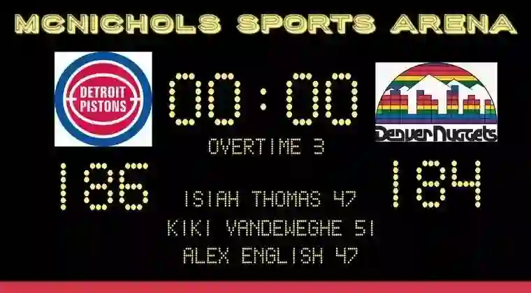 1983年12月13日,经历3个加时苦战,丹佛掘金和来访的底特律活塞共同创造了NBA历史最高的单场370分记录