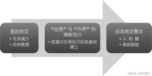我们尝试用一个简单的假说来统一解释一些看似冲突或离散的现象,从而建立一个自洽的理论,这正是运用物理学家们从第一原理出发的成功经验。哺乳动物有一套完整的感觉系统,基因突变引起的毛发减少、皮肤变敏感,为人体与外界提供了明晰的物理边界,也为人对于“自我”和“外界”的剖分(原意识)提供了物理基础。随着大脑快速发育、神经元不断建立连接,这种关于“自我”和“外界”的剖分演变成关于自我和世界的观念,形成强烈的自我意识,才能进一步探寻“自我”与“外界”的关系,进而产生高级智能。这整个演化过程我们定义为“触觉大脑假说”,如图1所示。