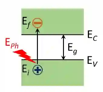 材料吸收光子产生载流子。如下图所示。如果到达材料的光子能量小于带隙 Eg,则不会被吸收。在一个电子从 Ei被激发到 Ef时就会在 Ei处产生一个空位。这个空位就会表现地像带正电子的粒子,称为空穴。