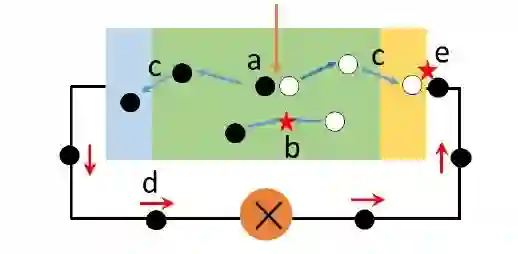 光生载流子的收集。载流子从吸光层抽取出来后通过外界电路给设备供电,电子空穴对的化学能从而转变成了电能,随后电子与空穴复合,整个循环回路结束。