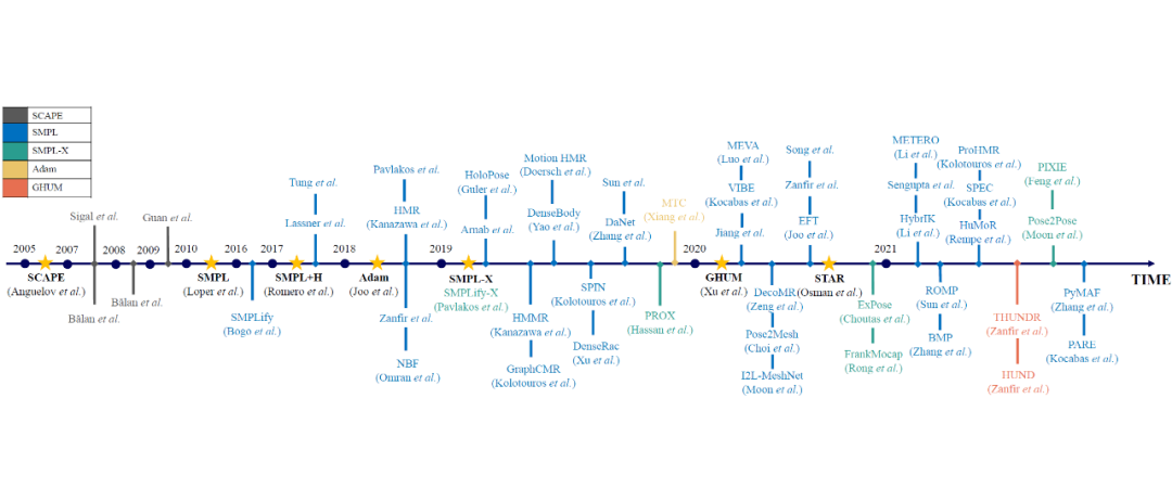 图 3 最相关的参数化人体模型和3D人体网格恢复方法时间轴