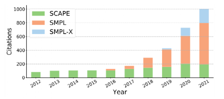 图 1 三种具有代表性的3D统计人体模型的年度引用,即SCAPE、SMPL和SMPL-X