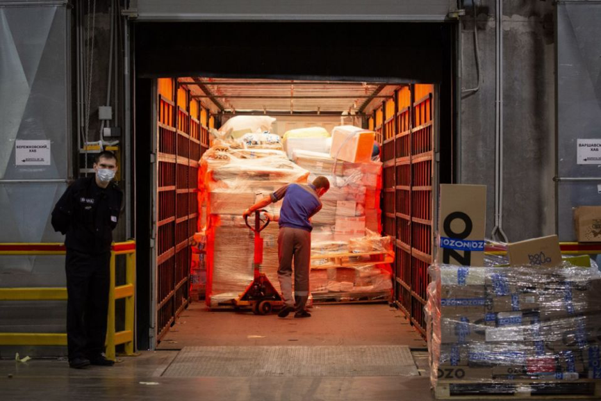 一名工人正在电商平台 Ozon 的转运仓搬运货物