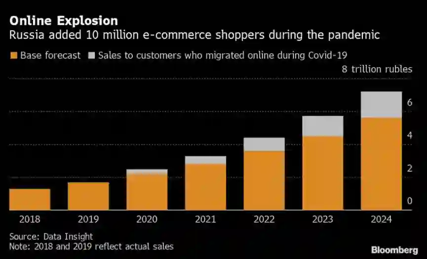 今年春天,俄罗斯第一轮新冠疫情爆发后,普京总统下令所有线下商店闭店两个月。这让消费者别无选择,只能涌向电商平台。据 Data Insight 研究人员称,2020年全俄互联网零售总额预计将飙升44%,达到2.5万亿卢布(320亿美元)。