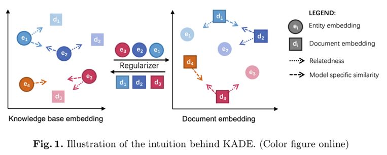文本选择了将知识图谱的实体和描述实体的文本进行对齐,首先将文本和知识图谱都通过表示学习映射到向量空间,学习到文本和实体的向量表示,在学习过程中加入正则约束使表示同一实体的实体向量和描述文本在向量空间中尽可能接近,知识图谱和文本的表示学习模型交替进行训练,从而在不影响文本和知识图谱各自的表示学习效果的情况下实现对齐。KADE的核心想法如下: